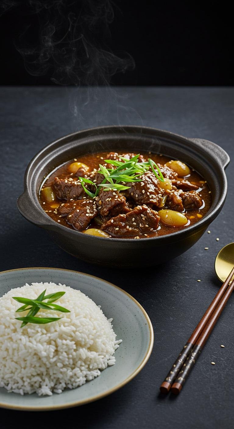 - Sear beef in a pot. Add onions and garlic; cook until fragrant.