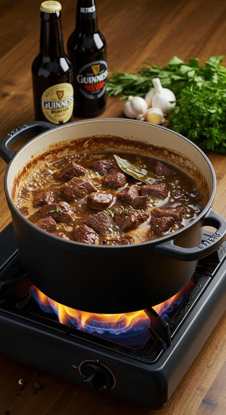 - Pour in Guinness, broth, carrots, and Worcestershire sauce.