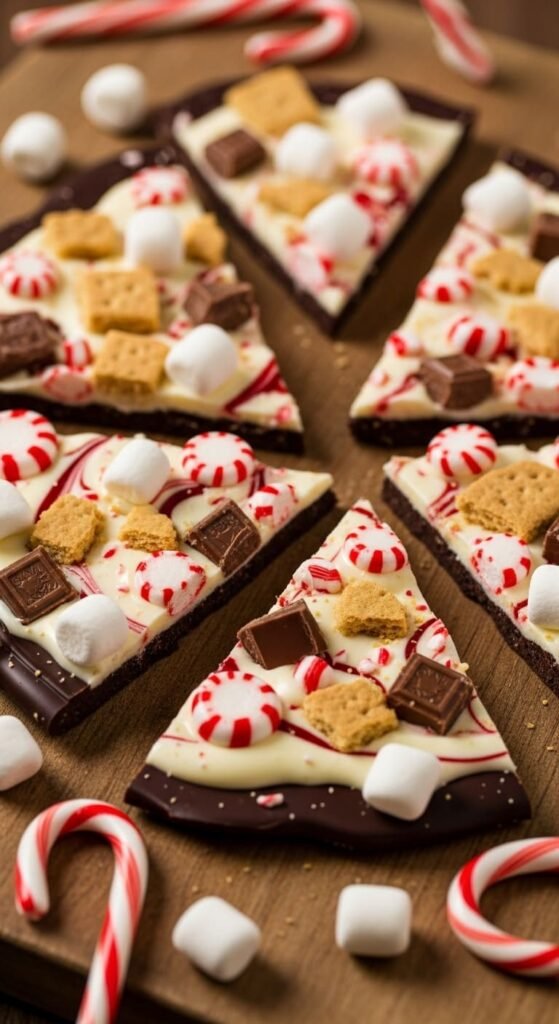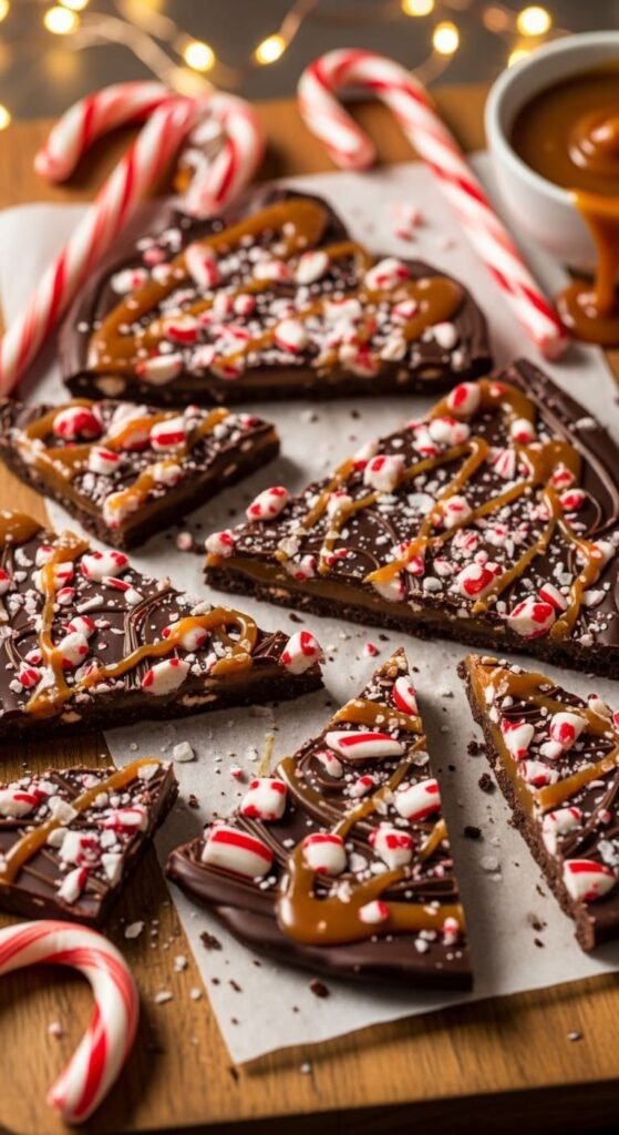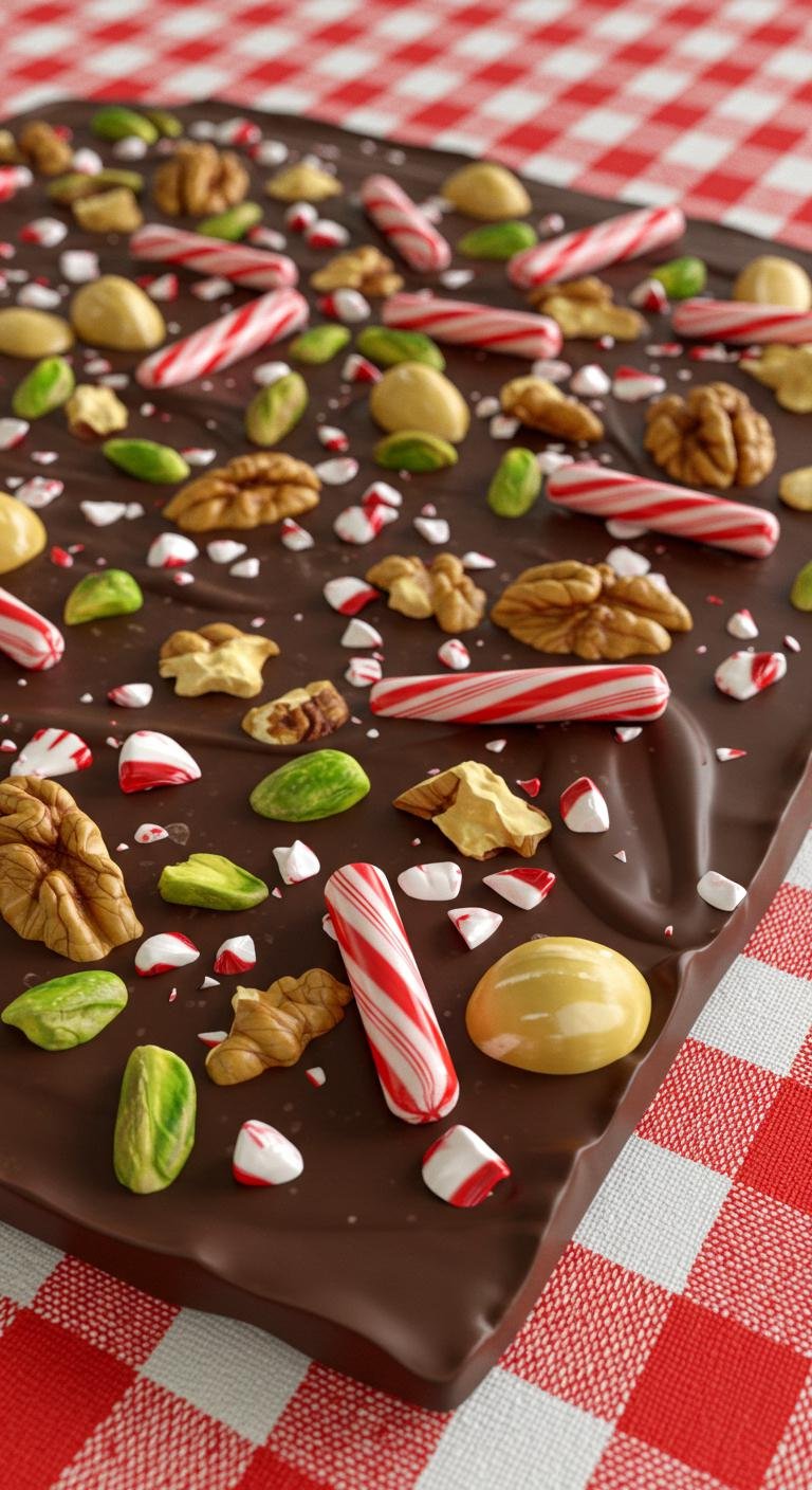 - Melt white chocolate, pour over dark chocolate, and immediately sprinkle with crushed candy canes.