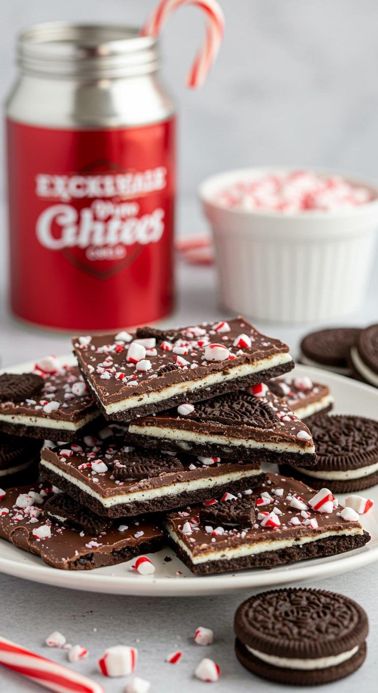 - Sprinkle crushed Oreos and candy canes over the melted chocolate.