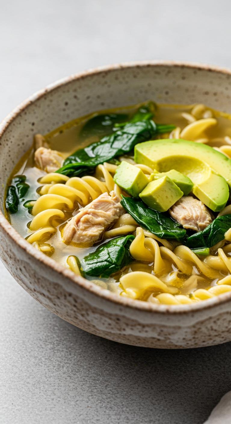 Spinach and Avocado Chicken Noodle Soup