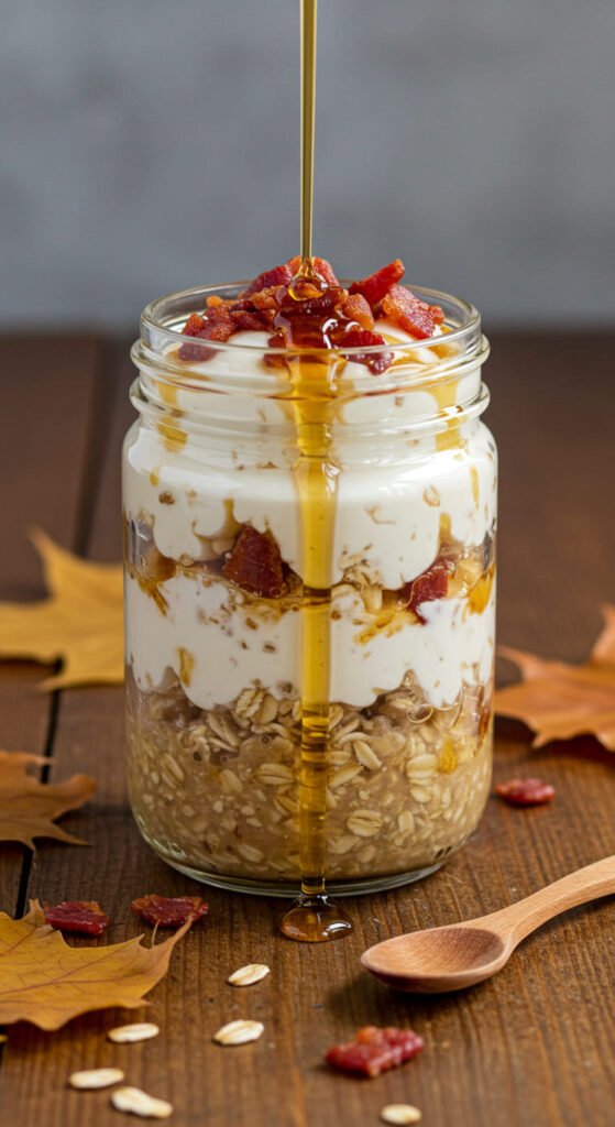 - In a jar, combine oats, milk, maple syrup, bacon, and cinnamon.