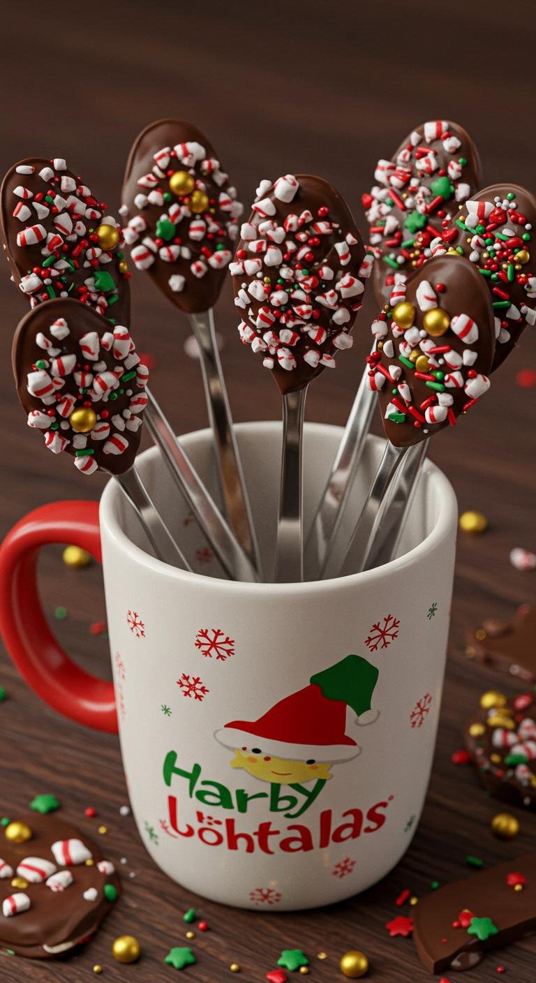 - Melt chocolate and dip the spoons, then sprinkle with candy.