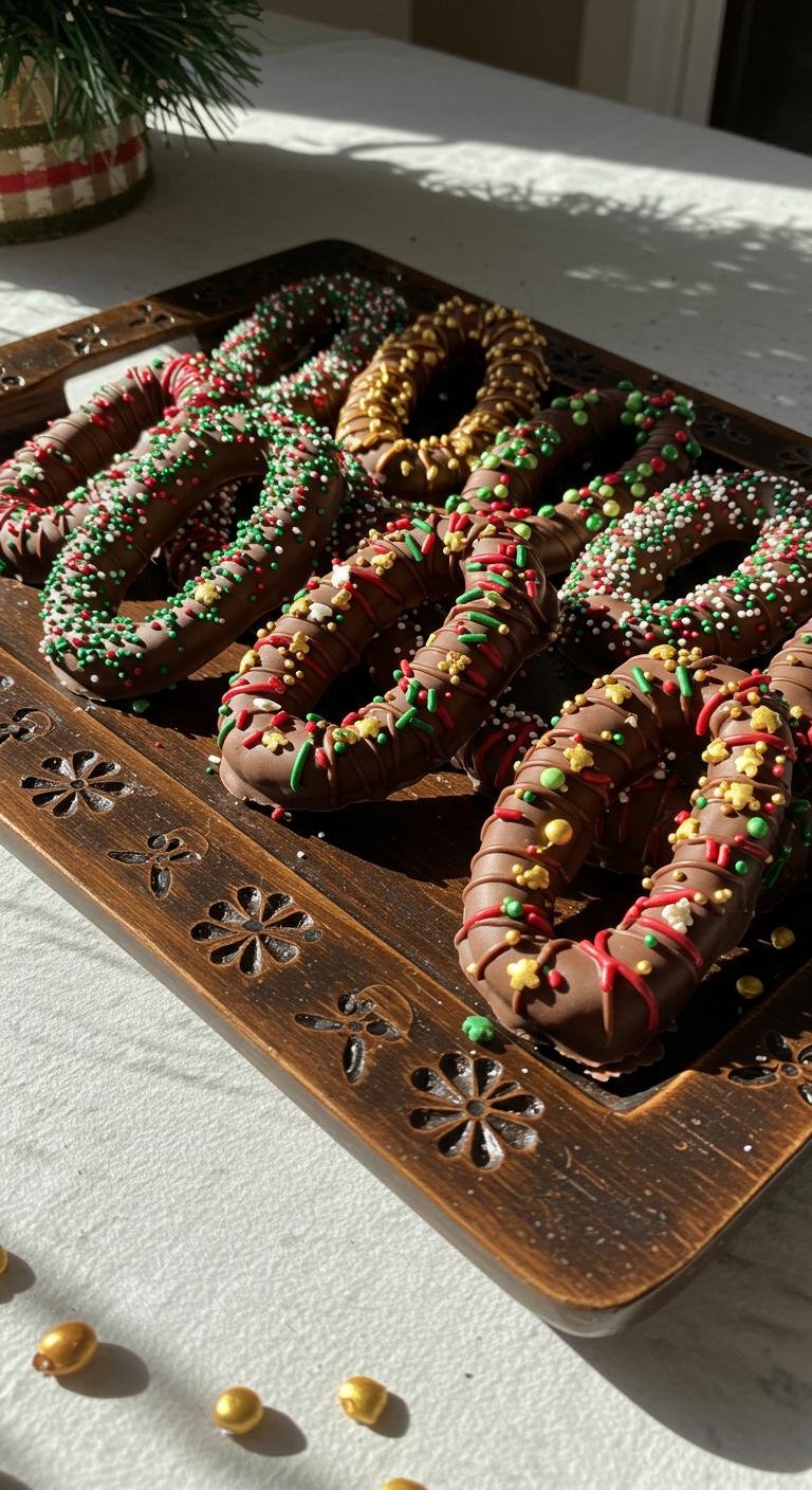- Melt chocolate, then dip pretzel rods in and shake off excess.