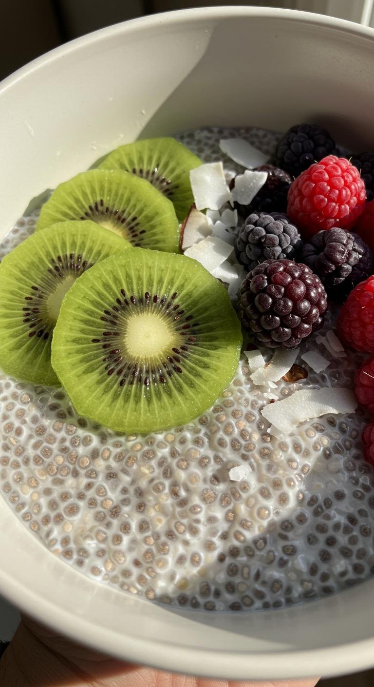 - Whisk coconut milk, chia seeds, maple syrup, and vanilla in a bowl.