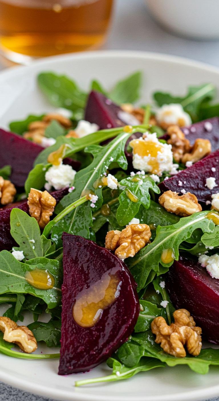 - Let beets cool, peel, and slice. Toss arugula with walnuts and feta.