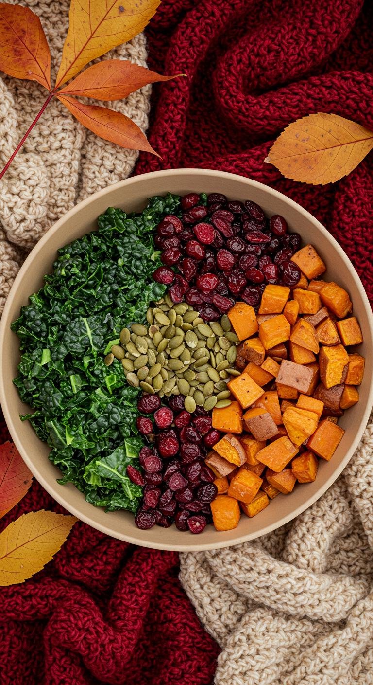 - Massage kale with olive oil; add sweet potatoes, cranberries, and pumpkin seeds.