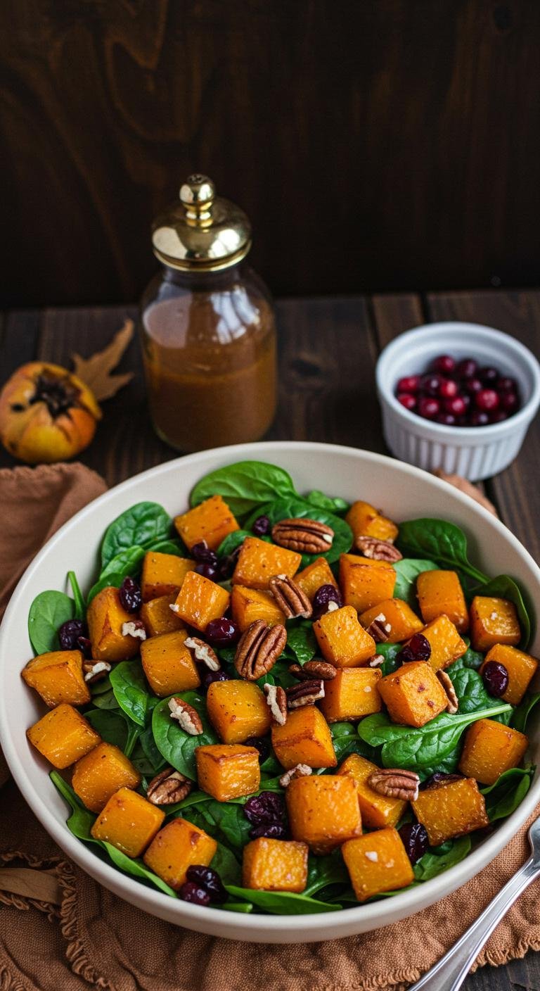 - In a bowl, mix spinach, pecans, cranberries, and roast pumpkin; toss gently.