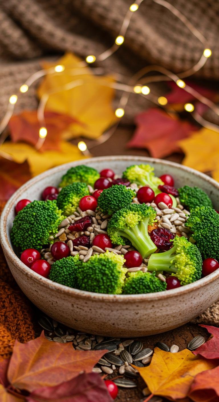 - In a large bowl, combine broccoli, cranberries, sunflower seeds, and onion.