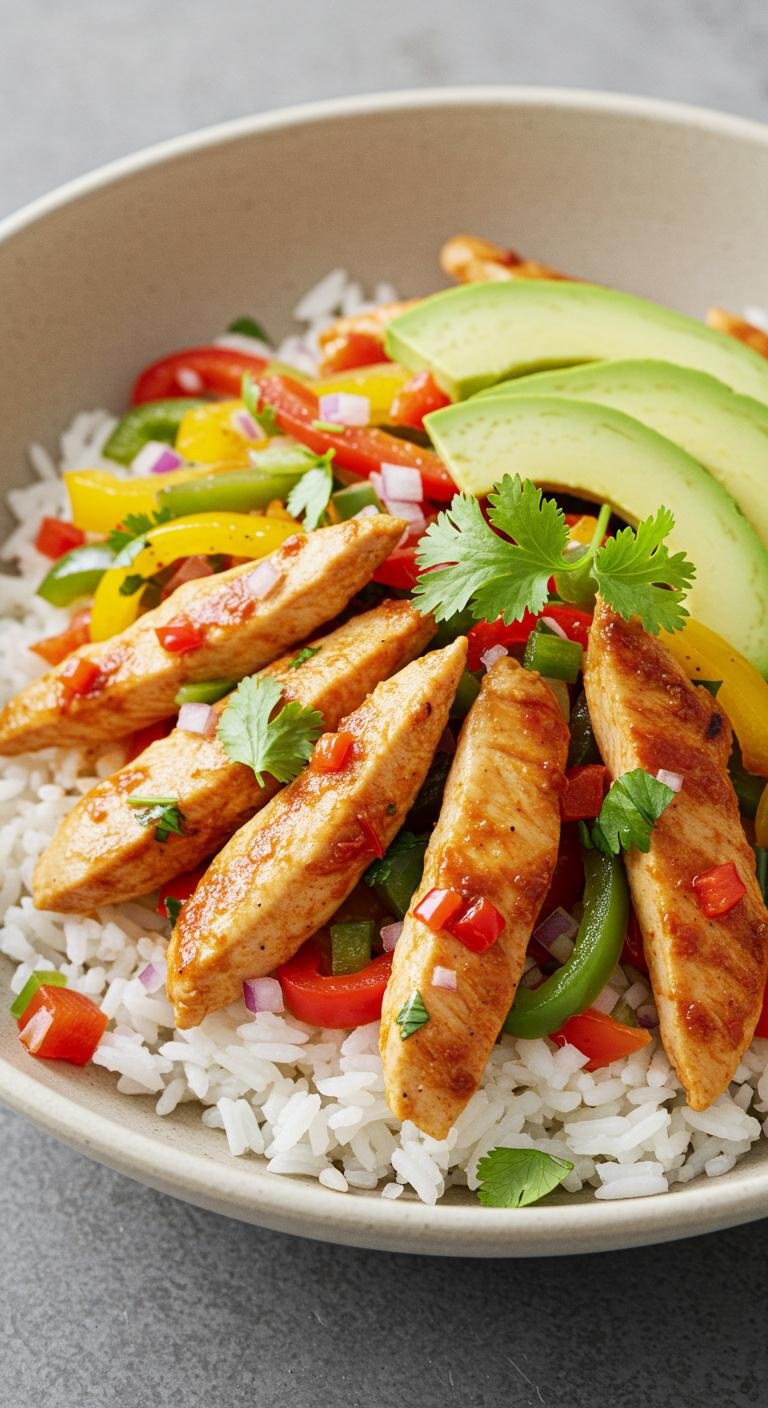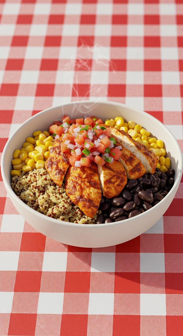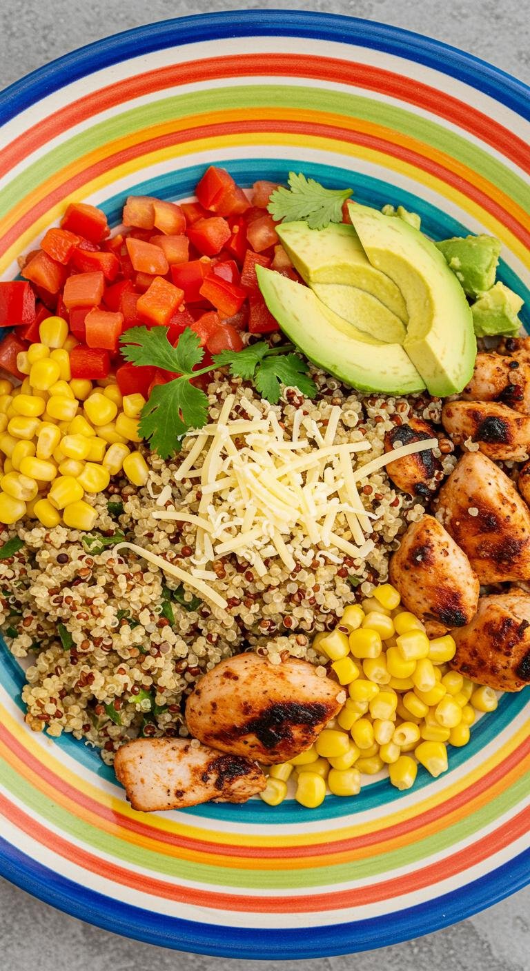 - In bowls, layer quinoa, chicken, bell peppers, corn, and avocado.