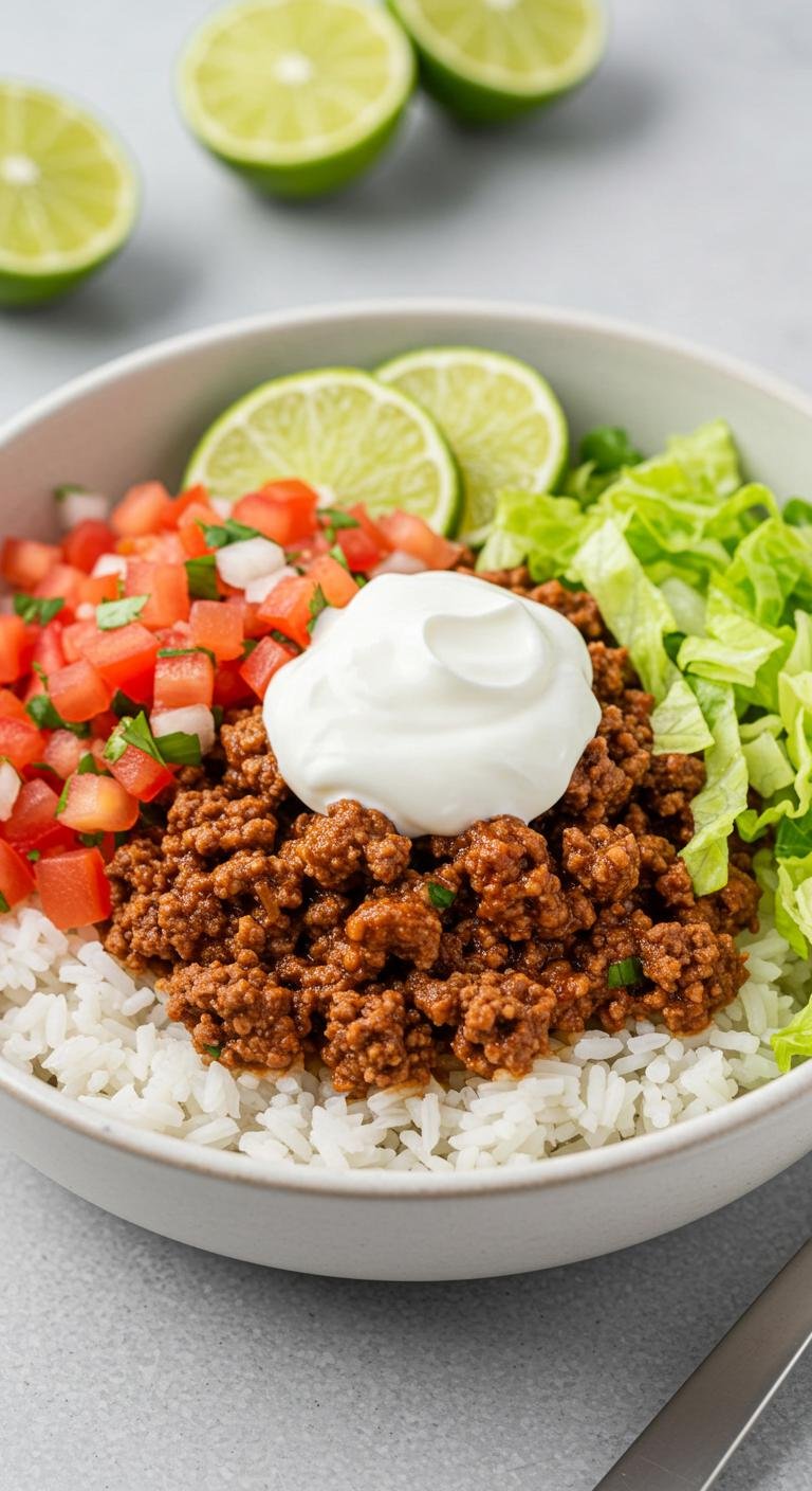- Assemble bowls with rice, beef, pico de gallo, and lettuce.