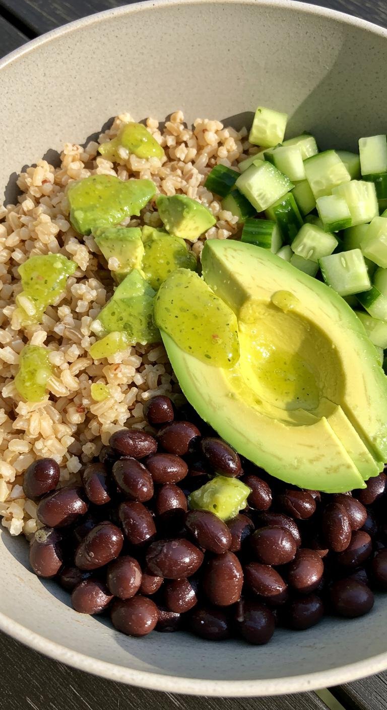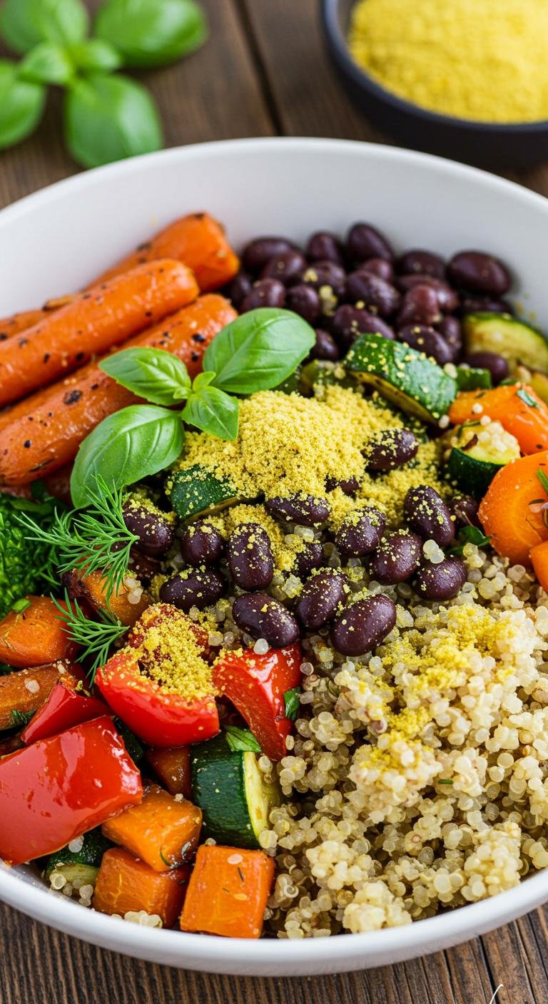- In a bowl, layer quinoa, black beans, and vegetables.