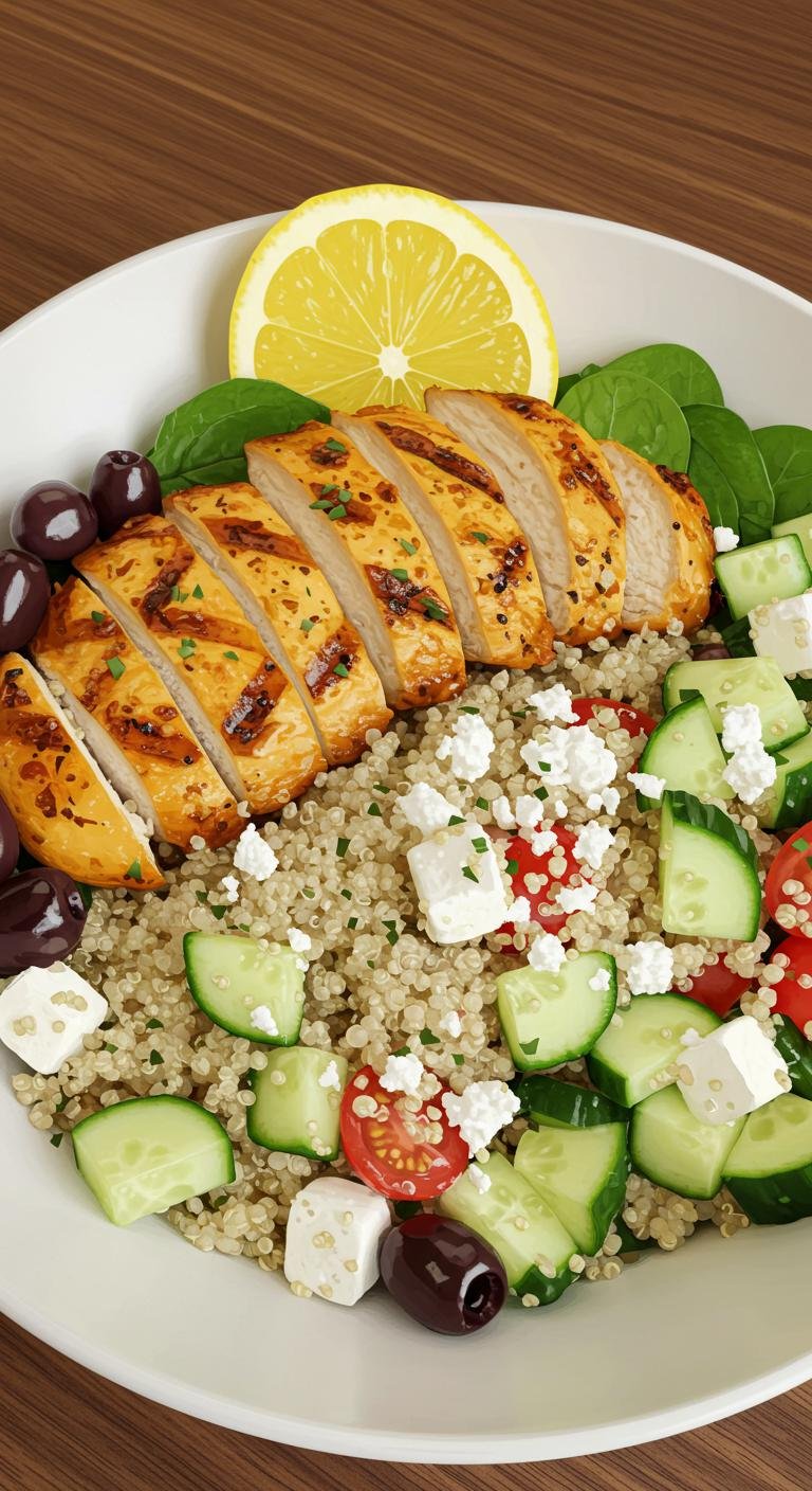 - Assemble bowls with quinoa, chicken, cucumber, and olives.