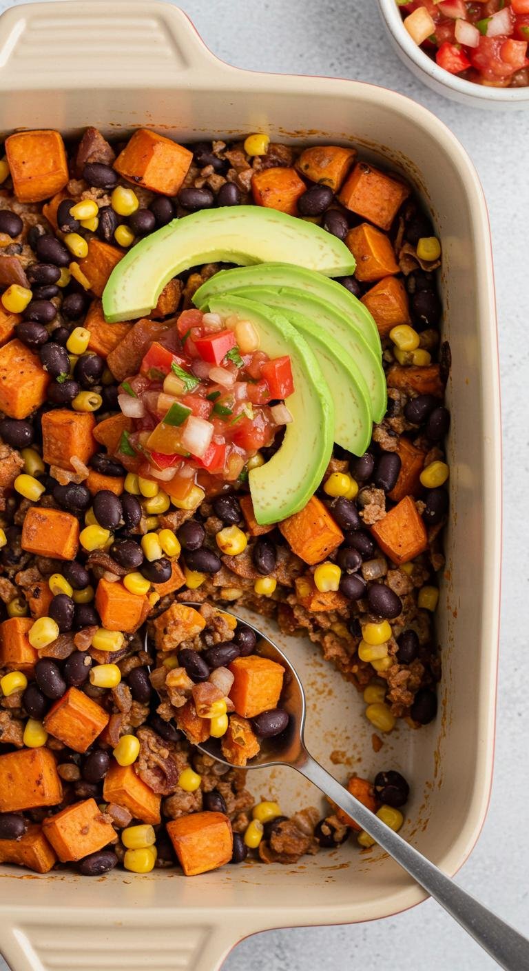 - Layer sweet potatoes, black beans, and corn in a casserole dish; season with cumin and chili powder.