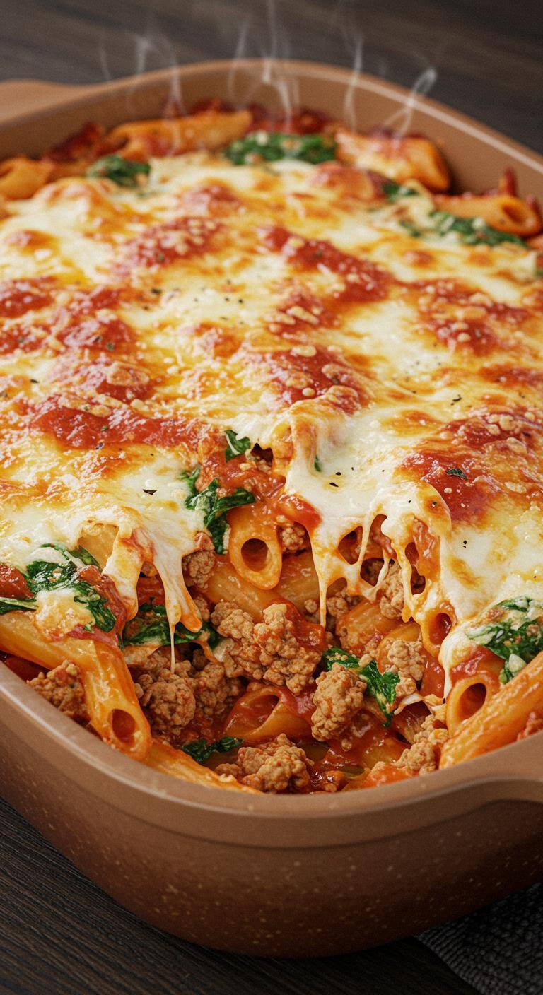 - Combine pasta, turkey mixture, and marinara sauce in a baking dish; top with cheese.