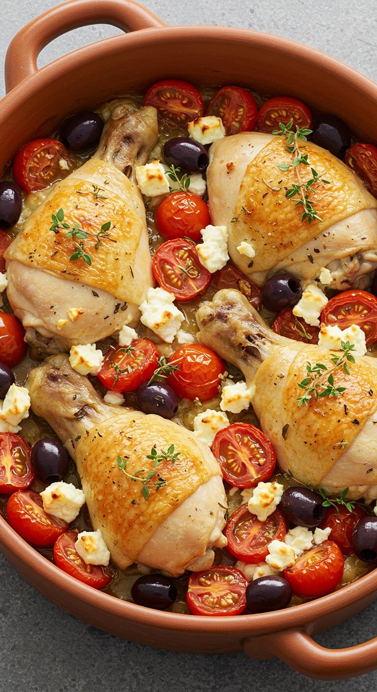 - Toss chicken, tomatoes, olives, and oregano in a baking dish; drizzle with olive oil and top with feta.