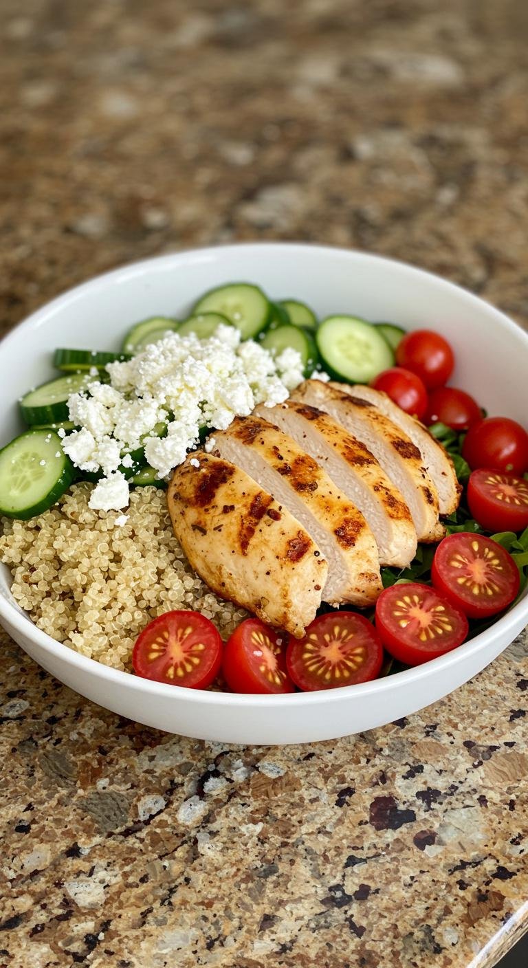 - Top with grilled chicken, cherry tomatoes, cucumber, and feta.