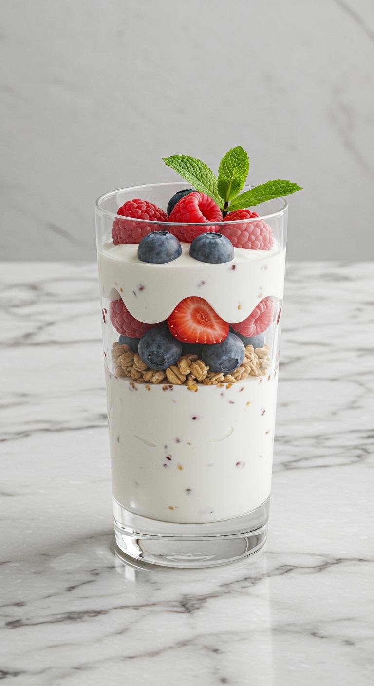 - In a glass, layer yogurt, berries, and granola.
