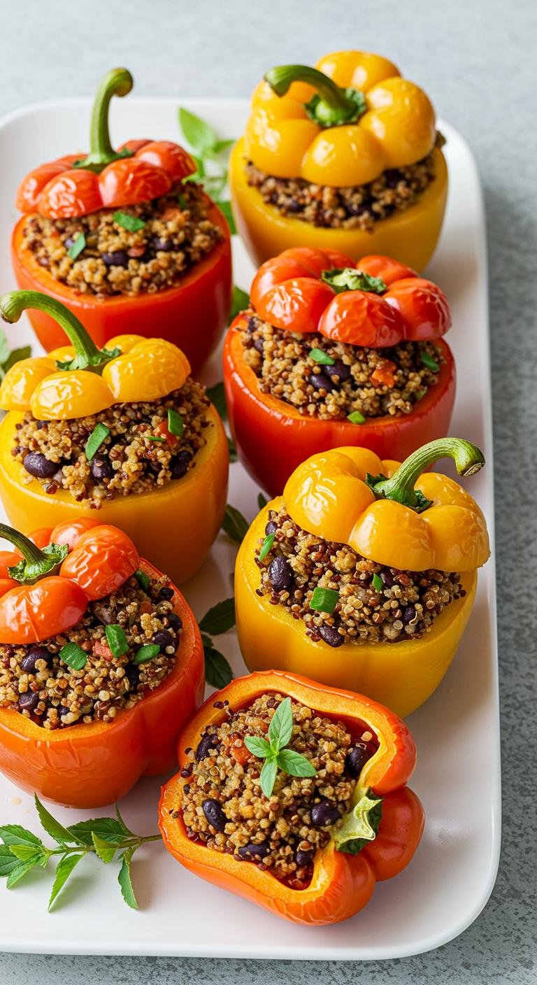 - Mix quinoa, black beans, and seasoning, then fill bell halves.