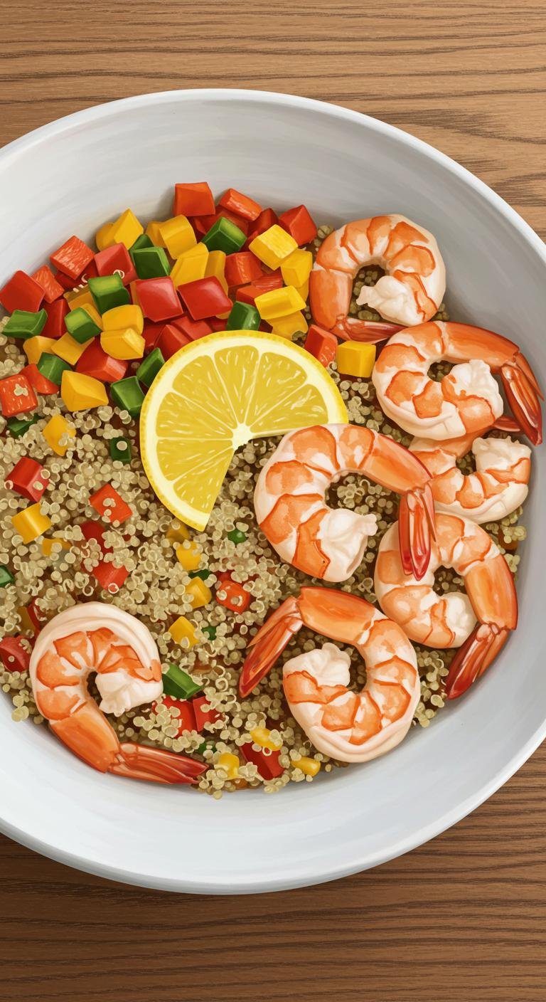 - Serve shrimp over quinoa, garnishing with green onions and lemon.