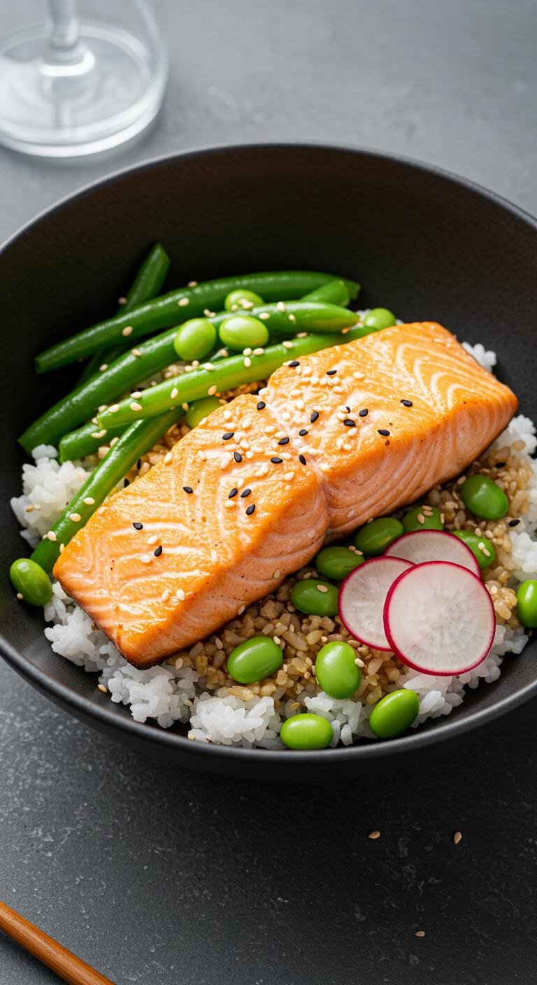- Serve salmon and beans on rice; add radishes and drizzle soy sauce.