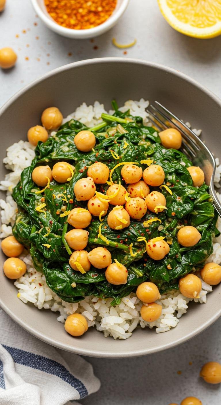 - Serve chickpea and spinach mixture over rice; garnish with lemon zest.