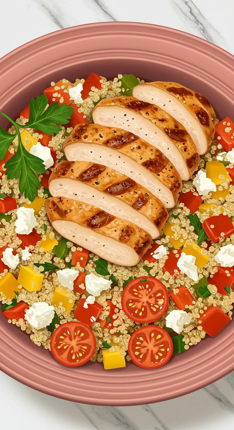 - In a large bowl, combine quinoa, bell peppers, and cherry tomatoes.
