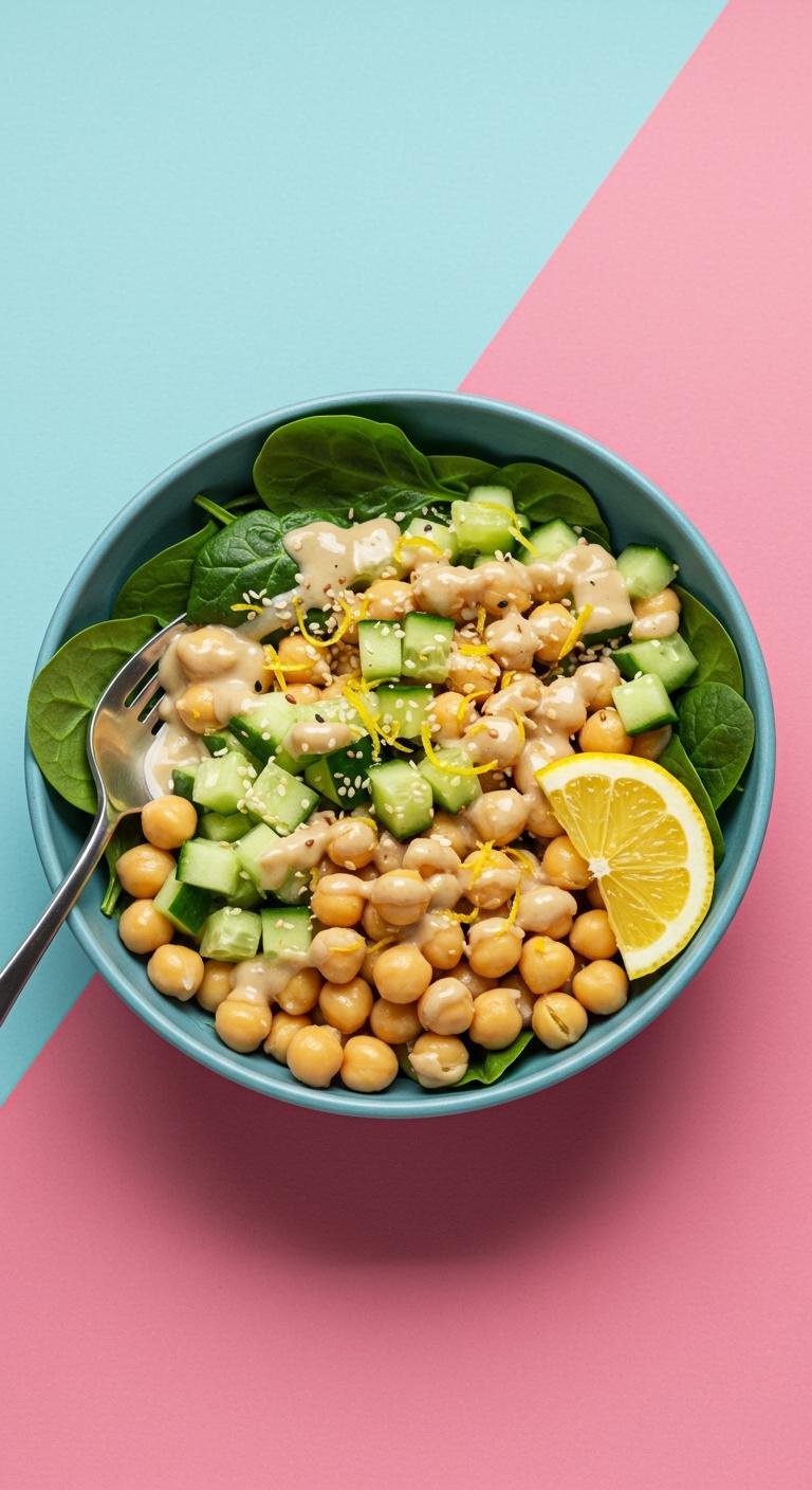 - In a bowl, mix chickpeas, spinach, and cucumber.