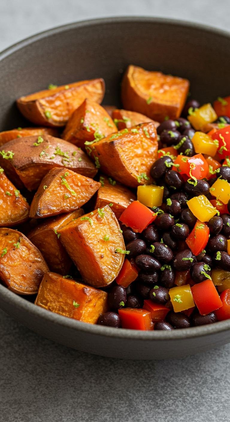 - In a bowl, mix roasted sweet potatoes, black beans, and bell pepper.