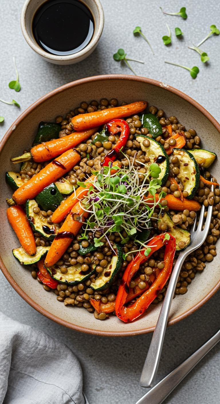 - Toss together cooked lentils and roasted vegetables in a large bowl.