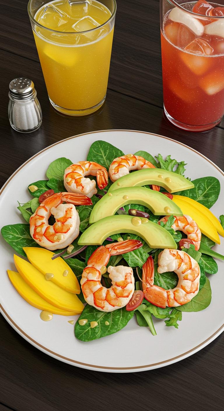 - Layer mixed greens on a plate and top with shrimp, mango, and avocado.