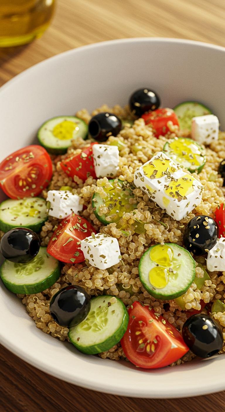 - In a large bowl, combine quinoa, cucumber, tomatoes, olives, and feta.