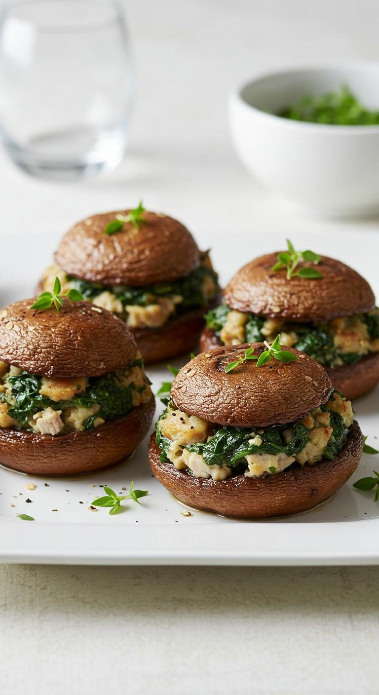 Delicious mushrooms filled with a lean turkey and spinach mixture, perfect as an appetizer or main dish.