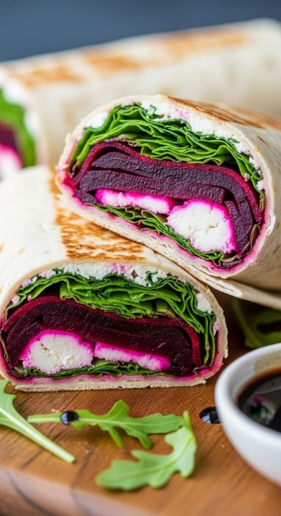 - Layer beets, goat cheese, and arugula on the tortilla.