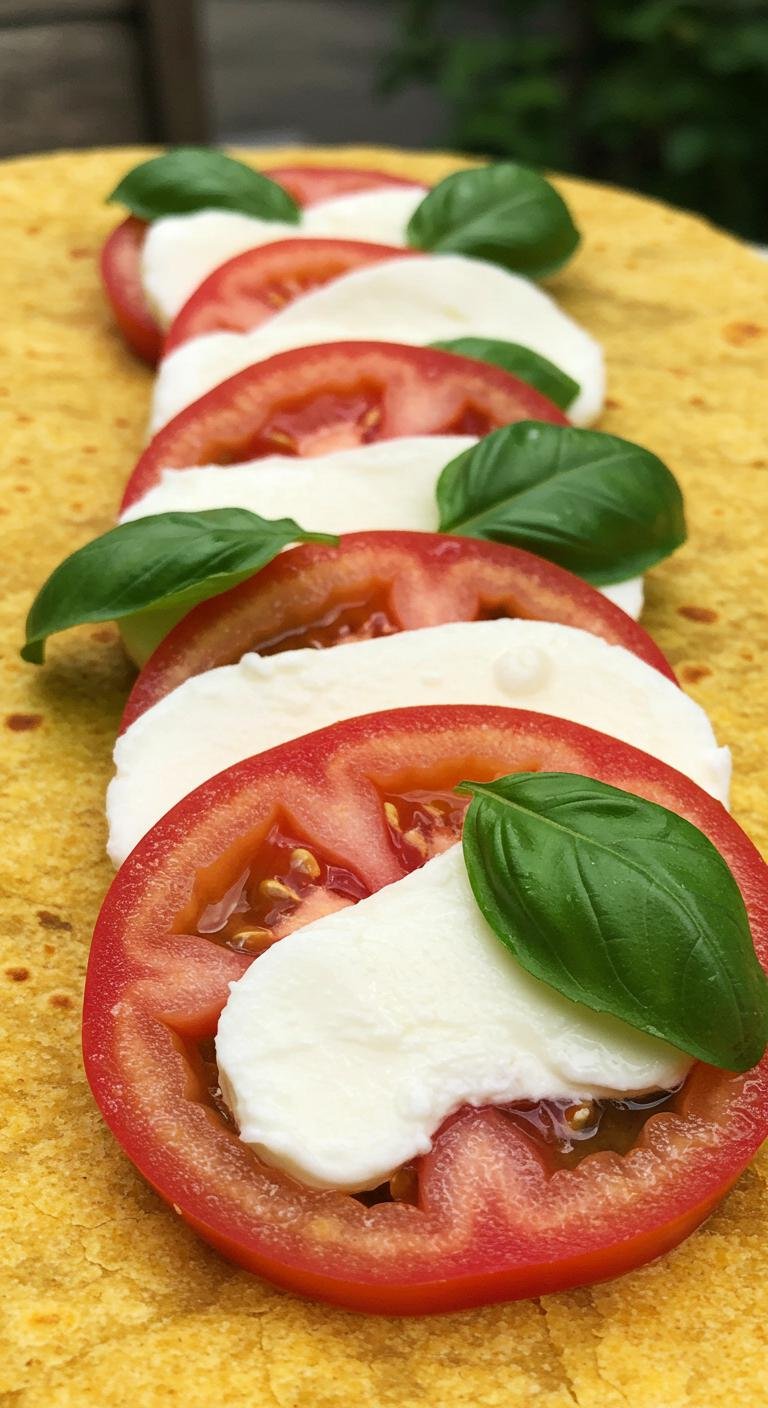 - Layer mozzarella, tomato, and basil on the tortilla.