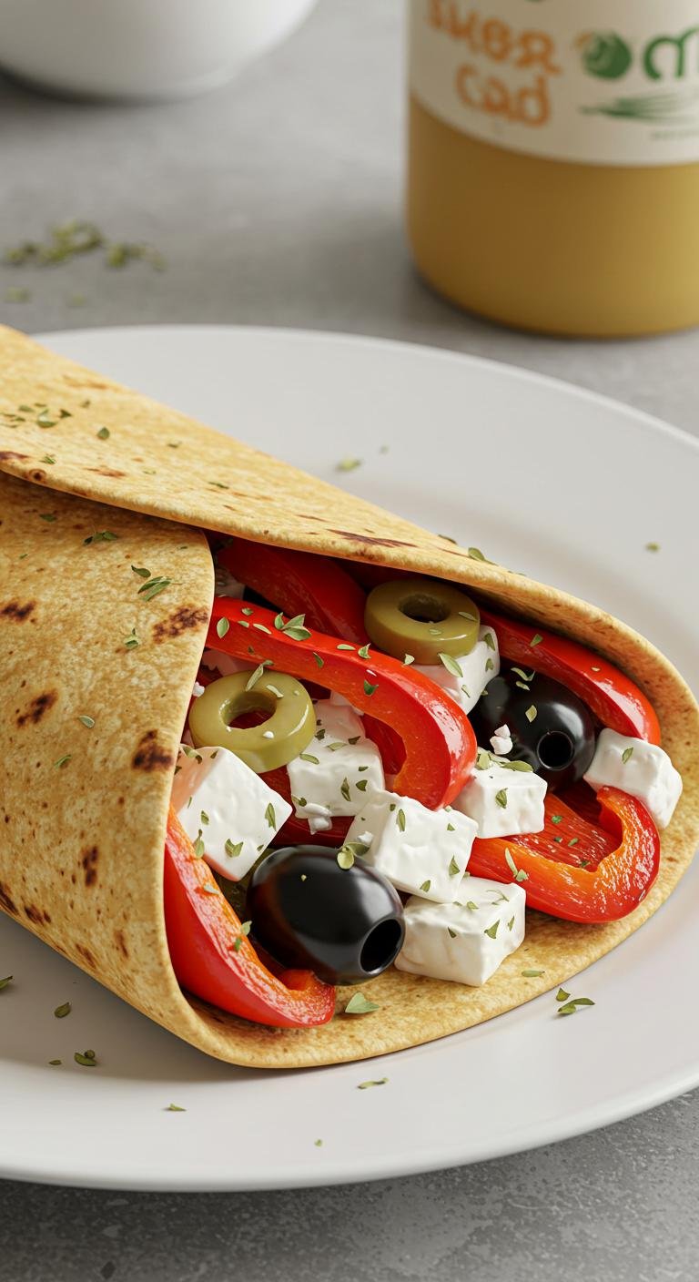 - Layer roasted peppers, olives, and feta on the tortilla.