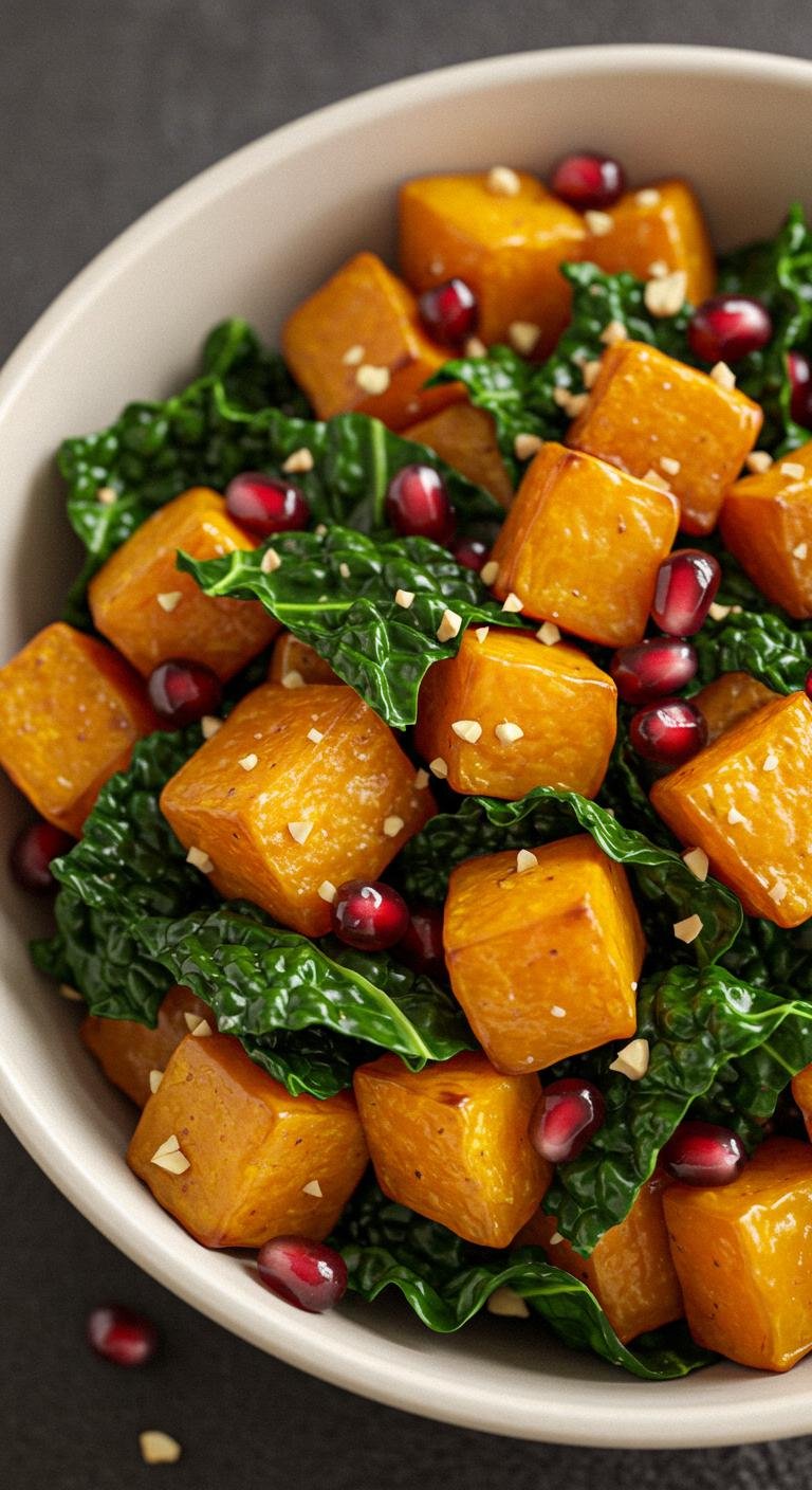- In a large bowl, combine kale, squash, pomegranate seeds, walnuts, and feta.