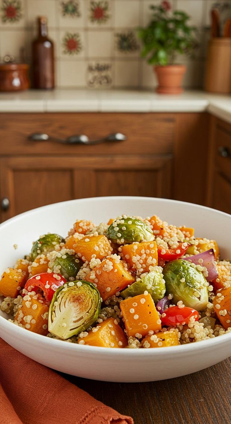 - In a large bowl, combine quinoa, Brussels sprouts, sweet potatoes, and cranberries.