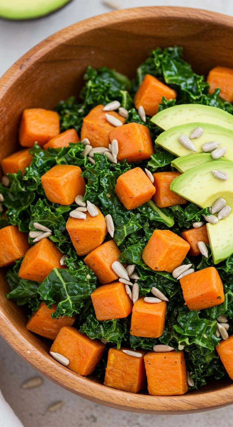 - In a bowl, combine kale, sweet potato, avocado, and sunflower seeds.