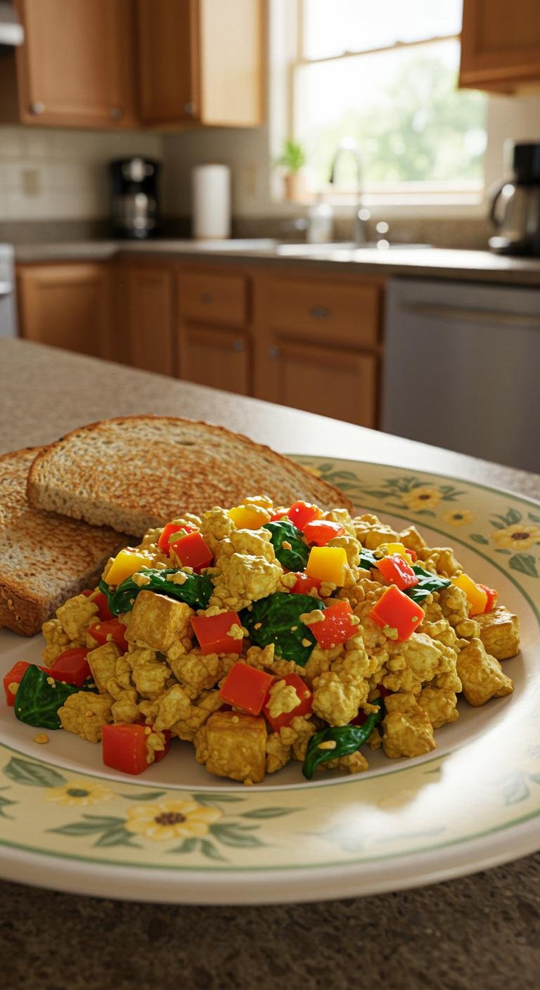 - Crumble tofu into a skillet, add vegetables and turmeric, and season.