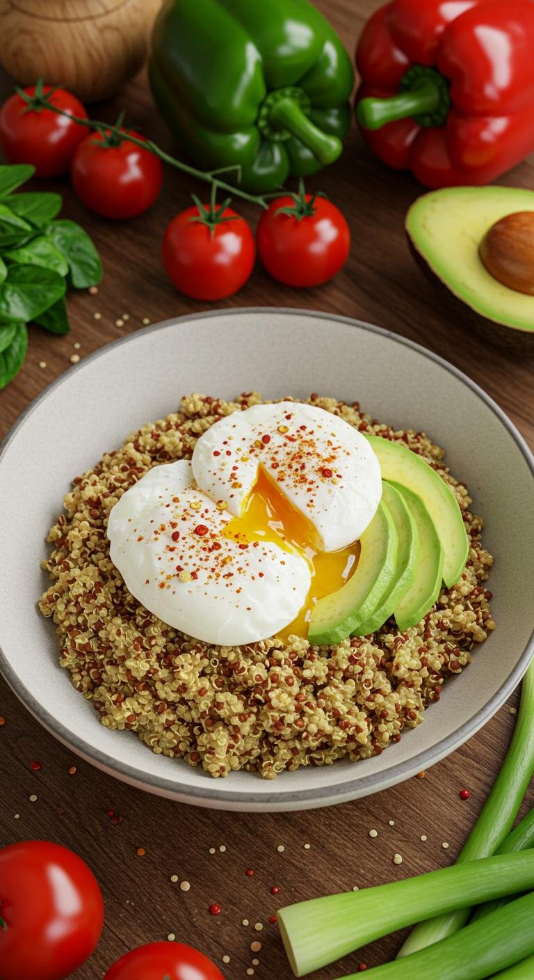 - Top warm quinoa with poached eggs, avocado, and seasoning.