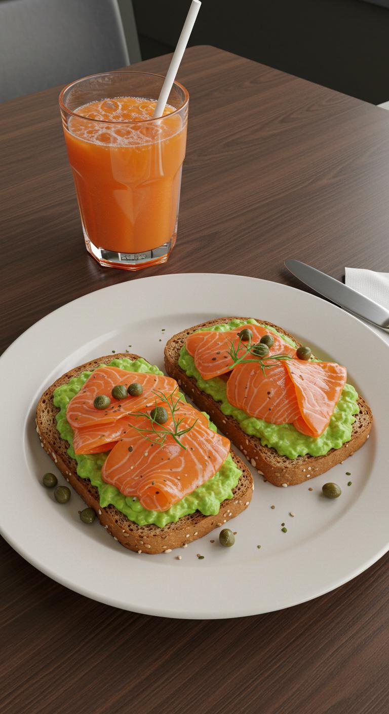 - Mash avocado on toast, top with salmon and herbs.