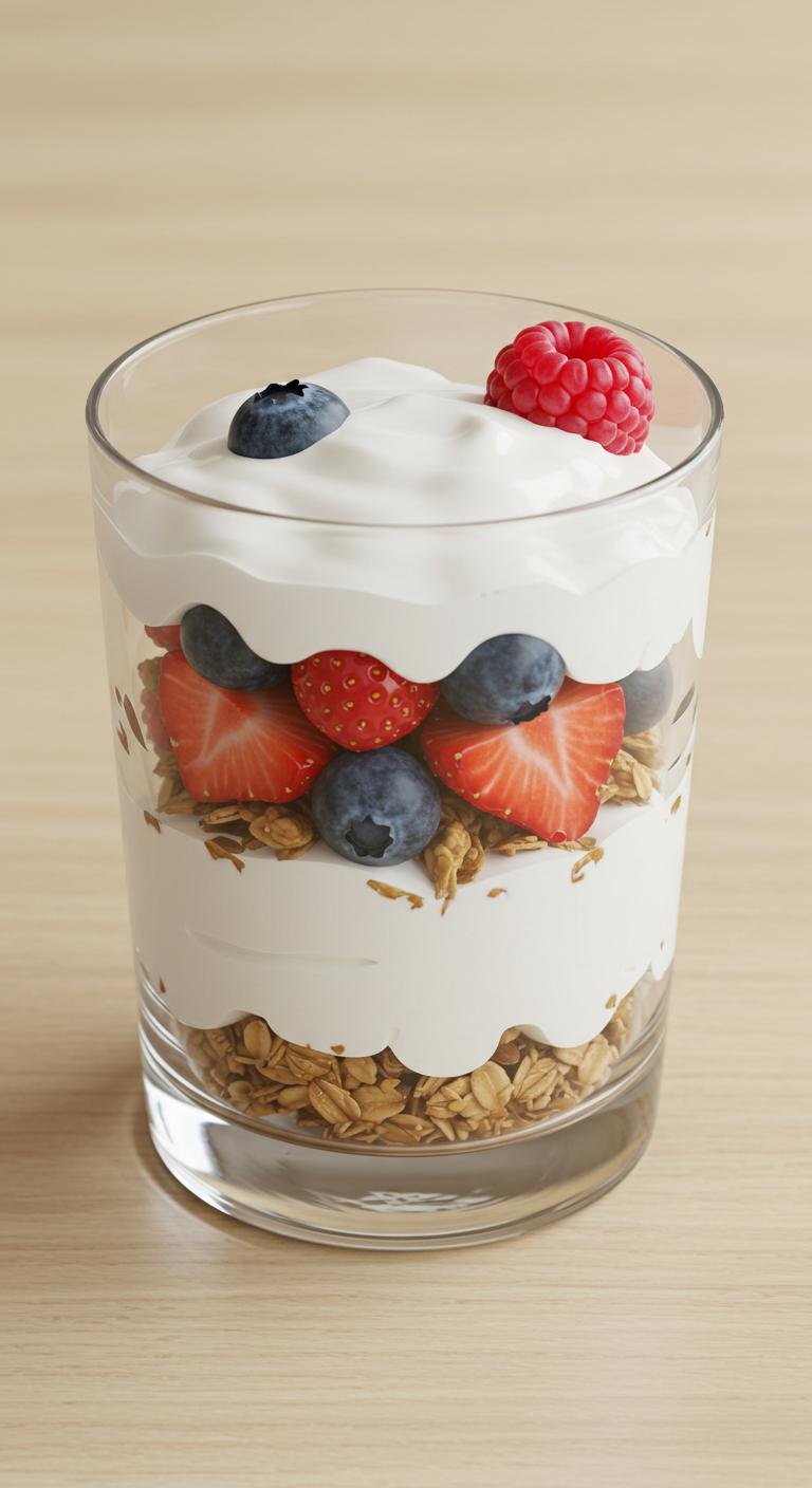 - In a glass, layer Greek yogurt, followed by berries and granola.