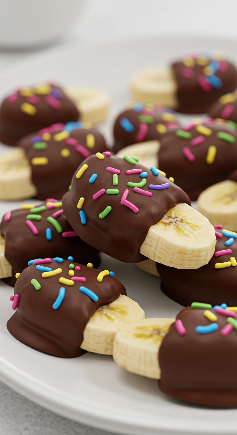 - Melt chocolate with coconut oil, then dip banana slices.
