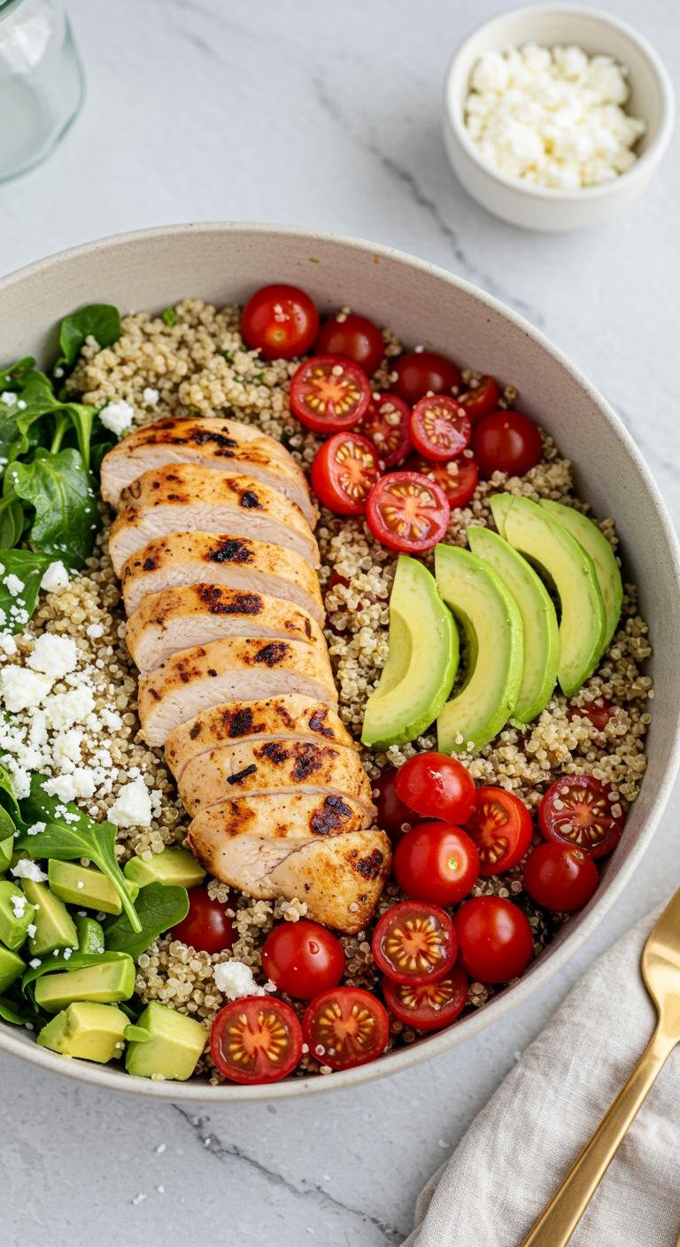 - Top with chicken, avocado, tomatoes, and feta.