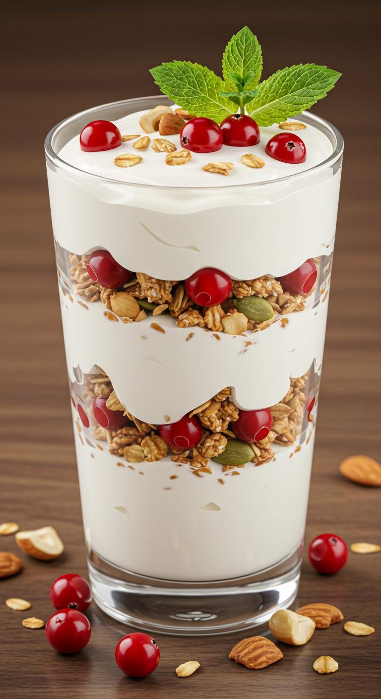 - In a glass, layer yogurt, granola, and berries.