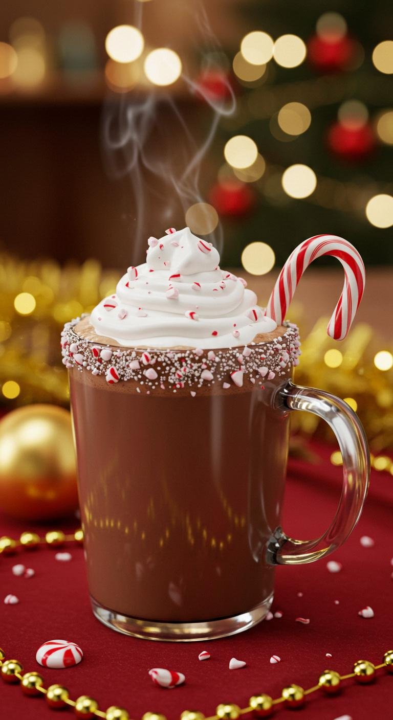 - Rim the glass with chocolate syrup and dip in crushed peppermint.
