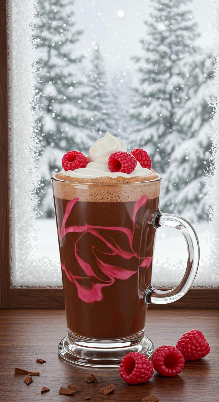 - Prepare hot chocolate and add raspberry syrup.