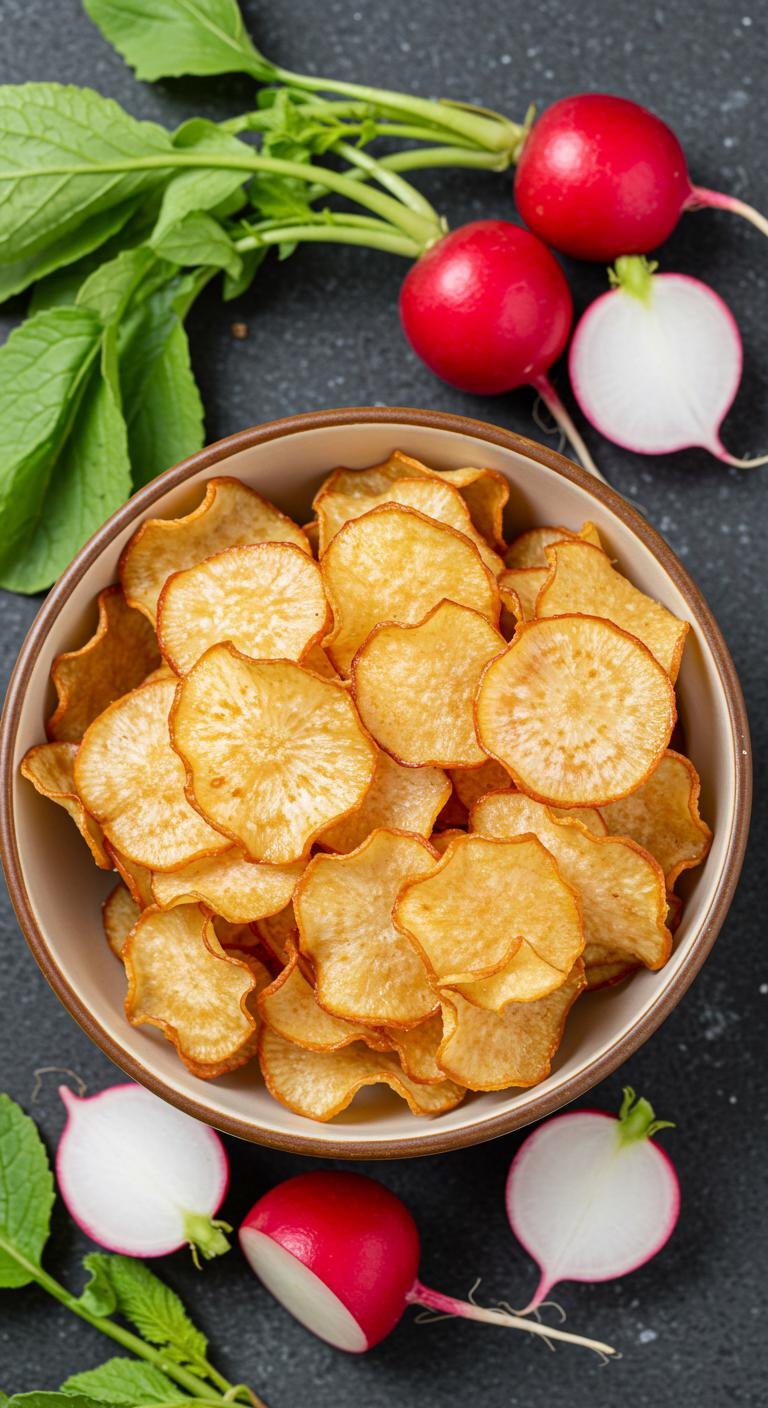 - Preheat oven to 400°F (200°C). Toss radish slices with olive oil, salt, and pepper.