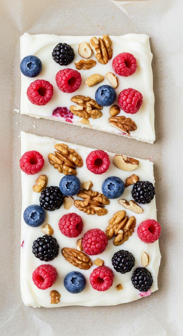 - Spread yogurt evenly on a baking sheet lined with parchment. Top with berries and nuts.